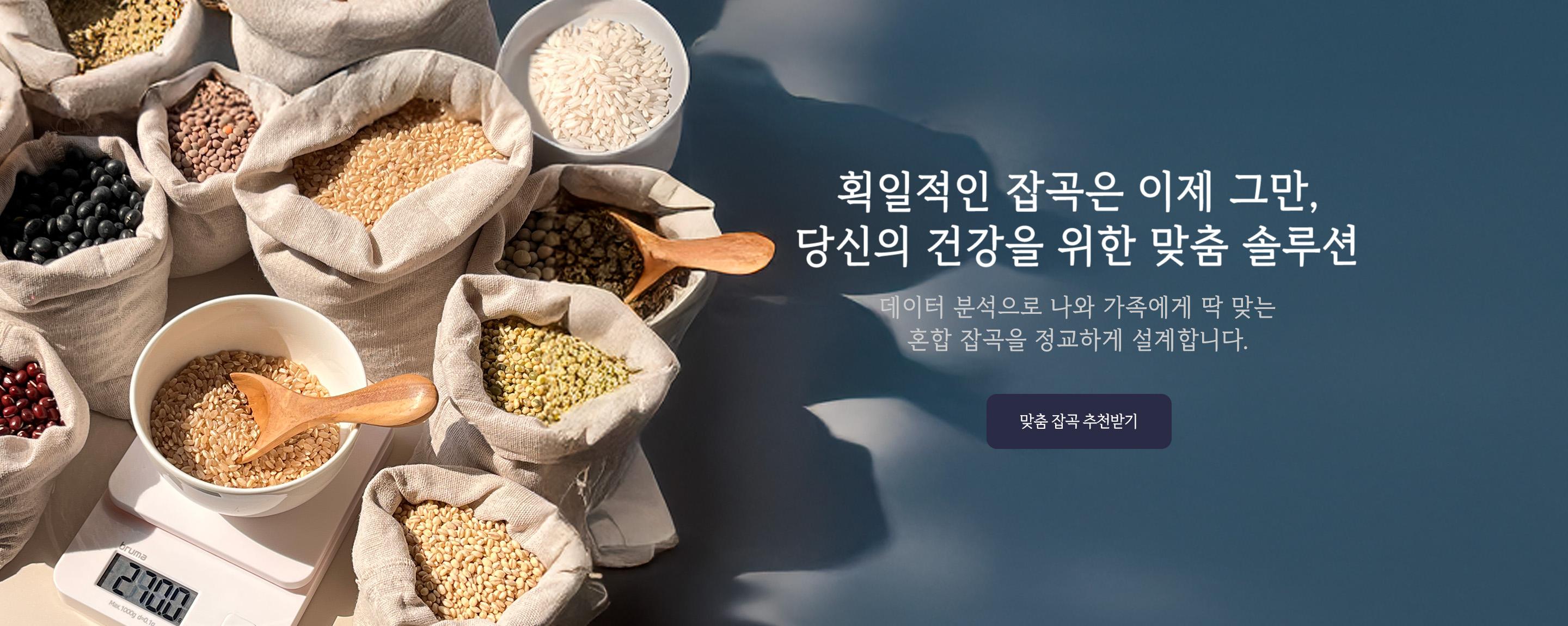 누구에게나 같은 혼합잡곡이 아닌 나와 가족에게만 집중된 곡물을 추천 받아보세요.